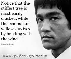 Notice that the stiffest tree is most easily cracked, while the bamboo or willow survives by bending with the wind. - Bruce Lee